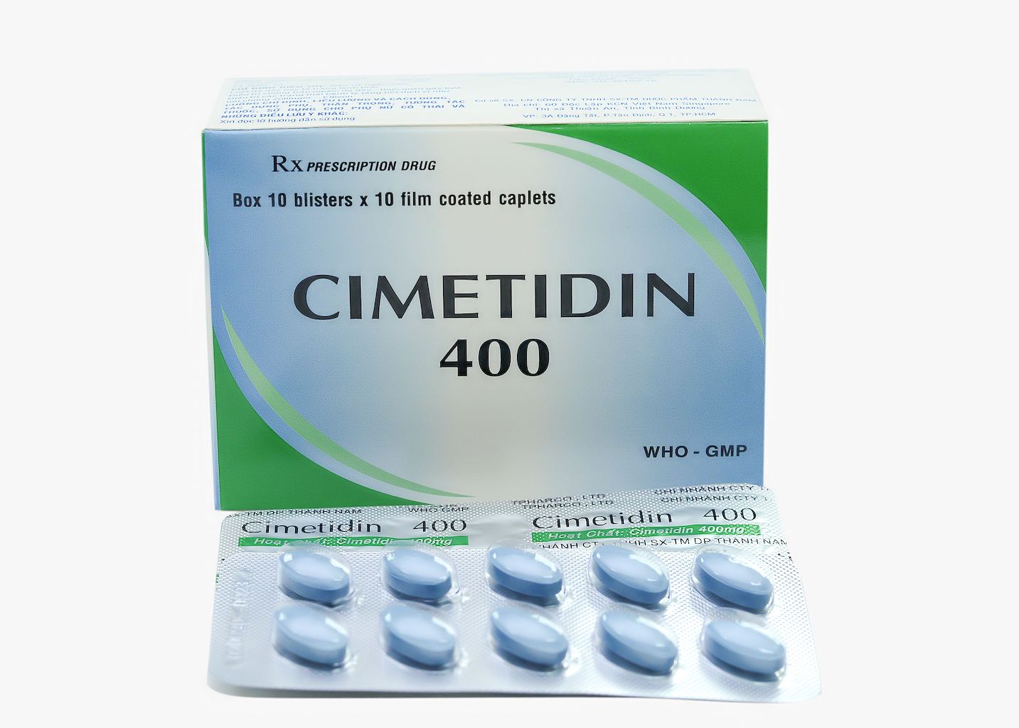 Thuốc này chỉ dùng theo đơn thuốc.Để xa tầm tay trẻ em.Đọc kỹ hướng dẫn sử dụng trước khi dùng.THÀNH PHẦN:Mỗi viênnén bao phim chứa:Thành phần dược chất: Cimetidin ……………………… 400 mgThành phần tá dược: Avicel PH101, Tinh bột sắn, PVP.K30, Gelatin, Natri starch glycolat, Menthol, Magnesi stearat, Talc, HPMC 2910, PEG 6000, Dầu Paraffin, Titan dioxyd, Ponceau 4R, Màu xanh patent.DẠNG BÀO CHẾ: Viên nén dài bao phim màu xanh dương, mùi menthol, hai mặt trơn.CHỈ ĐỊNHĐiều trị ngắn hạn:Loét dạ dày hay tá tràng lành tính.Điều trị chứng trào ngược dạ dày – thực quản gây loét. Điều trị các trạng thái bệnh lý tăng tiết dịch vị như hội chứng Zollinger – Ellison.CÁCH DÙNG, LIỀU DÙNGCách dùng: Dùng theo đường uống. Liều dùng: Tổng liều thường không quá 2,4 g/ngày. Giảm liều ở người suy thận, có thể cần giảm liều ở người suy gan.Người lớn:Trị loét dạ dày, tá tràng: Dùng liều duy nhất 2 viên/ngày, vào buổi tối trước lúc đi ngủ, hoặc mỗi lần 1 viên, ngày 2 lần (vào bữa ăn sáng và buổi tối), uống ít nhất trong 4 tuần đối với loét tá tràng và ít nhất trong 6 tuần đối với loét dạ dày, 8 tuần đối với loét do dùng thuốc chống viêm không steroid. Liều duy trì là 1 viên một lần vào trước lúc đi ngủ hoặc 2 lần vào buổi sáng và buổi tối.Điều trị chứng trào ngược dạ dày – thực quản: 1 viên/lần, 4 lần/ngày (vào bữa ăn và trước lúc đi ngủ) hoặc 2 viên/lần, 2 lần/ngày, trong 4 đến 8 tuần.Hội chứng Zollinger – Ellison: 1 viên/lần, 4 lần/ngày. Có thể tăng tới 6 viên/ngày