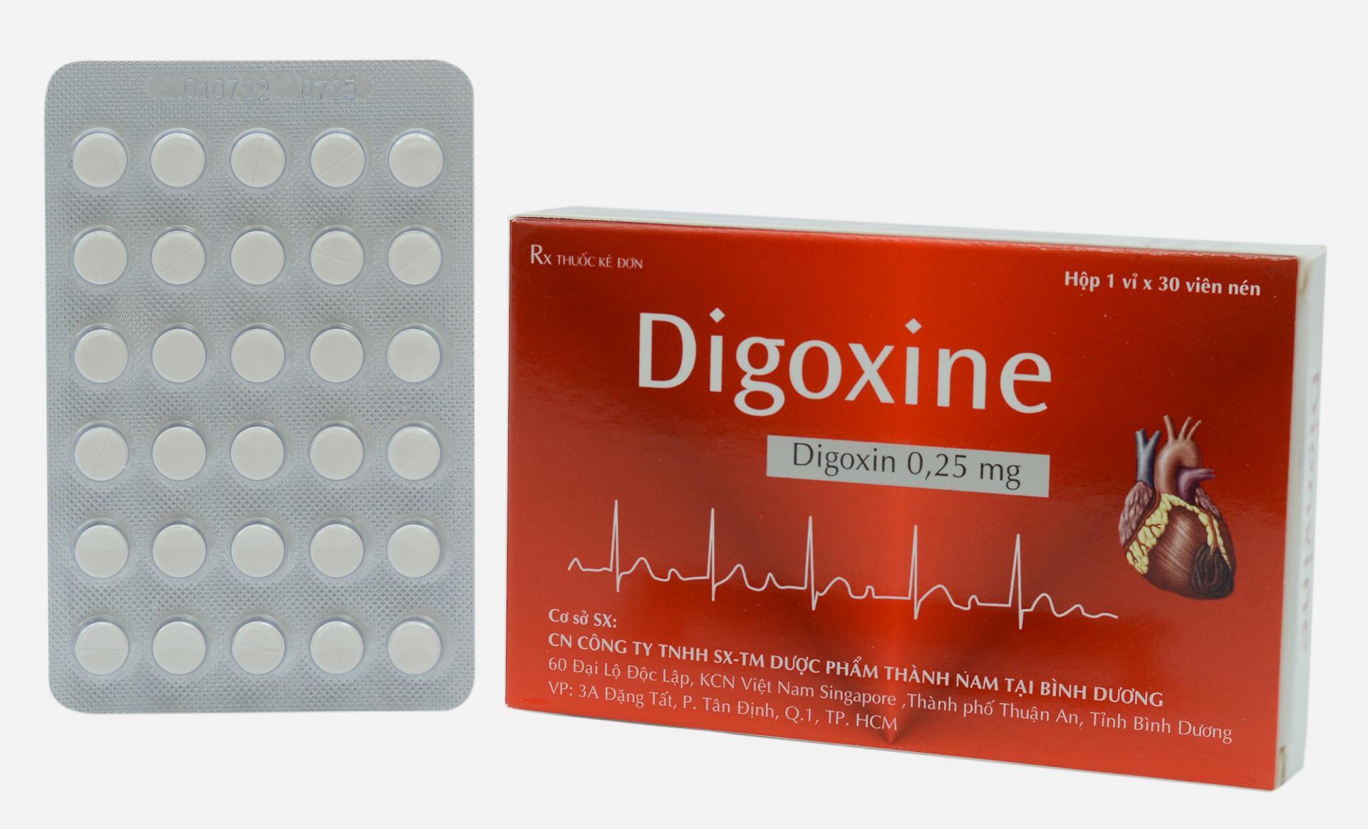 Thuốc này chỉ dùng theo đơn thuốc. Để xa tầm tay trẻ em. Đọc kỹ hướng dẫn sử dụng trước khi dùng THÀNH PHẦN: Mỗi viên nén chứa: Thành phần dược chất: Digoxin ………………………………… 0,25 mg Thành phần tá dược: Avicel PH101, Tinh bột sắn, PVP. K30, Natri starch glycolat, Talc, Magnesi stearat. DẠNG BÀO CHẾ: Viên nén tròn màu trắng, một mặt có vạch “/”, một mặt trơn. CHỈ ĐỊNH Suy tim, rung nhĩ và cuồng động nhĩ nhất là khi có tần số thất quá nhanh, nhịp nhanh trên thất kịch phát. CÁCH DÙNG, LIỀU DÙNG Cách dùng: Dùng theo đường uống. Liều dùng: Cần điều chỉnh liều theo từng người bệnh. Điều hết sức quan trọng là xác định để biết người bệnh có dùng dạng thuốc digitalis nào trong 2 hoặc 3 tuần trước, vì một ít tác dụng còn tồn lại đòi hỏi phải giảm liều để tránh ngộ độc. Xác định liều dựa trên thể trọng lý tưởng (khối nạc), vì digoxin không phân bố vào mô mỡ. Có sự khác nhau về sinh khả dụng giữa các dạng thuốc của digoxin. Khi thay đổi dạng thuốc điều trị, cần phải hiệu chỉnh liều lượng. Liều 100 microgam (0,1 mg) cuả thuốc tiêm hoặc nang chứa dung dịch digoxin tương đương sinh học với liều 125 microgram (0,125 mg) của viên nén hoặc cồn ngọt digoxin. Liều dùng người lớn: Điều trị chậm bằng digoxin: Liều bình thường dùng một lần trong ngày là 0,125 - 0,500 mg (½ - 2 viên). Có thể chia liều hàng ngày thành 2 lần, một buổi sáng và một buổi chiều. Mức liều điều trị dự định (trạng thái ổn định) đạt được trong vòng 5 - 10 ngày, nếu người bệnh có chức năng thận bình thường. Điều quan trọng là phải dùng liều duy trì với thời biểu dùng thuốc rất đều đặn. Điều trị cấp tính, nhanh bằng digoxin: Liều lượng phải tuân theo sự chỉ dẫn của bác sĩ và luôn có sự theo dõi của bác sĩ. Người bệnh cân nặng 70 kg và không béo dùng 1,5 mg uống. Dùng liều này như sau: Bắt đầu 0,75 - 1 mg uống, khi cần thì cho một liều khác: 0,50 mg, cứ 6 giờ một lần, cho tới khi đạt tác dụng đầy đủ. Tổng liều ngày đầu không được quá 2 mg dạng uống. Liều người cao tuổi: Dùng liều digoxin quá thấp cho người cao tuổi không thỏa đáng (liều như vậy thường cho 1 nồng độ dưới mức điều trị) và liều phải cho tùy theo người bệnh (0,0625 mg/ngày). Liều trẻ em: Không dùng viên nén digoxin cho trẻ em dưới 5 tuổi. Ở trẻ lớn hơn, liều cần thiết gần bằng liều tính theo kg thể trọng dùng cho người lớn có thận bình thường, nghĩa là 0,007 mg/kg/ngày là liều uống duy trì. Thường dùng liều duy trì cho trẻ em cứ 12 giờ một lần. Thay đổi từ digitoxin sang digoxin: Trong tuần thứ nhất, sau khi ngừng digitoxin, chỉ dùng nửa liều duy trì digoxin. Nếu không, sẽ có nguy cơ quá liều và ngộ độc, vì digitoxin có nửa đời thải trừ rất chậm. Sau một tuần đã dùng nửa liều duy trì, dùng digoxin với liều duy trì đầy đủ hàng ngày, bắt đầu từ đầu tuần thứ hai, sau khi ngừng digitoxin. CHỐNG CHỈ ĐỊNH Quá mẫn với digoxin hoặc bất kỳ một thành phần nào của thuốc. Blốc tim hoàn toàn từng cơn, blốc nhĩ - thất độ hai; loạn nhịp trên thất gây bởi hội chứng Wolff - Parkinson - White; bệnh cơ tim phì đại tắc nghẽn (trừ khi có đồng thời rung nhĩ và suy tim, nhưng phải thận trọng). Phải thận trọng cao độ bằng giám sát điện tâm đồ nếu người bệnh có nguy cơ cao tai biến tim phải điều trị. CẢNH BÁO VÀ THẬN TRỌNG Nguy cơ cao tác dụng có hại (ADR) về tim ở người có nhịp tim chậm nhiều, hậu quả của nhịp nút xoang, nhịp tim nhanh nhĩ hoặc rung và cuồng động nhĩ. Ở người có nhồi máu cơ tim cấp tính, nguy cơ ADR tim cũng tăng lên, nhưng thường có nhu cầu cao về digitalis. Với người suy giảm chức năng thận và người thiểu năng tuyến giáp, cần điều chỉnh liều và theo dõi chặt chẽ. Tính nhạy cảm với ADR tăng lên ở người có giảm kali huyết, tăng calci huyết và người cao tuổi. SỬ DỤNG CHO PHỤ NỮ CÓ THAI VÀ CHO CON BÚ Thời kỳ mang thai Không có tư liệu về nguy cơ gây độc hại đối với thai, mặc dù digitalis đã được dùng từ lâu. Việc sử dụng được coi là an toàn, và khi cần cải thiện tuần hoàn, có thể dùng digitalis ở người mang thai. Thời kỳ cho con bú Digoxin được phân bố vào sữa người, nhưng với liều điều trị bình thường không chắc có nguy cơ tác dụng trên trẻ nhỏ bú sữa mẹ. ẢNH HƯỞNG CỦA THUỐC LÊN KHẢ NĂNG LÁI XE, VẬN HÀNH MÁY MÓC Lưu ý thuốc có thể gây ngủ lơ mơ, chóng mặt, do đó phải thận trọng khi lái xe và vận hành máy móc. TƯƠNG TÁC, TƯƠNG KỴ Tương tác Những thuốc sau đây gây nhiều tương tác nên cần phải hiệu chỉnh liều: Amiodaron, ciclosporin, indomethacin, itraconazol, calci, quinin, quinidin, cholestyramin, thuốc lợi tiểu quai, propafenon, spironolacton, thuốc lợi tiểu thiazid, thuốc lợi tiểu giống thiazid, hormon tuyến giáp, verapamil. Tương kỵ Do không có các nghiên cứu về tính tương kỵ của thuốc, không trộn lẫn thuốc này với các thuốc khác. TÁC DỤNG KHÔNG 