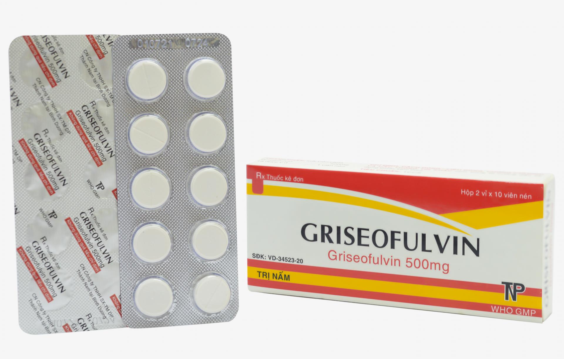 Thuốc này chỉ dùng theo đơn thuốc. Để xa tầm tay trẻ em. Đọc kỹ hướng dẫn sử dụng trước khi dùng THÀNH PHẦN: Mỗi viên nén chứa: Thành phần dược chất: Griseofulvin ………………….. 500 mg Thành phần tá dược: Avicel PH101, PVP. K30, Natri starch glycolat, Magnesi stearat, Talc DẠNG BÀO CHẾ: Viên nén tròn màu trắng, một mặt có vạch “/” được dập thẳng trên viên, một mặt trơn. CHỈ ĐỊNH Điều trị nhiễm nấm da, da đầu, tóc hoặc móng tay khi điều trị tại chổ thất bại hoặc không phù hợp. CÁCH DÙNG, LIỀU DÙNG Cách dùng: Dùng theo đường uống. Nên uống cùng hoặc sau bữa ăn. Liều hàng ngày có thể uống 1 lần hoặc chia 2 - 4 lần. Thời gian điều trị tùy thuộc độ dày của lớp sừng (keratin), vị trí nhiễm bệnh và đáp ứng của từng người bệnh. Nói chung, cần điều trị liên tục ít nhất từ 2 - 8 tuần với nhiễm nấm da và tóc, tới 6 tháng đối với nhiễm nấm móng tay và 12 tháng hoặc hơn với nhiễm nấm móng chân. Liều dùng: Người lớn từ 18 tuổi trở lên: Liều bình thường 500 - 1000 mg/ngày, uống 1 lần hoặc 2 lần mỗi ngày. Liều tối thiểu không nên thấp hơn 10 mg/kg cân nặng /ngày. Việc chia liều hai lần mỗi ngày có thể hiệu quả hơn ở những bệnh nhân đáp ứng kém. Trẻ 12 - 18 tuổi: 500 mg/ngày, uống 1 lần hoặc chia làm nhiều lần, trường hợp bệnh nặng có thể tăng liều gấp đôi và giảm liều khi có đáp ứng. Trẻ em từ 2 – 12 tuổi: Dạng bào chế này không thích hợp cho việc chia liều. Liều thông thường là 10 – 20 mg/kg cân nặng/ngày. Người bệnh có suy gan: Griseofulvin chống chỉ định ở những bệnh nhân bị suy gan nặng. Đối với bệnh nhân suy gan từ nhẹ đến trung bình, không cần điều chỉnh liều lượng. Tuy nhiên, griseofulvin có thể dẫn đến suy giảm chức năng gan, do đó phải theo dõi thường xuyên chức năng gan. Người bệnh có suy thận: Không điều chỉnh liều lượng ở những bệnh nhân suy thận nặng; suy thận không dẫn đến sự tích tụ. Người cao tuổi: Không cần điều chỉnh liều lượng ở người cao tuổi. Cần cân nhắc ở những bệnh nhân có thể bị suy gan. CHỐNG CHỈ ĐỊNH Quá mẫn với Griseofulvin hoặc với bất kỳ thành phần nào của thuốc. Loạn chuyển hóa Porphyrin. Suy gan nặng. Lupus ban đỏ (Lupus Erythematosus) hệ thống (SLE). Mang thai và cho con bú. CẢNH BÁO VÀ THẬN TRỌNG Griseofulvin được khuyến khích sử dụng sau bữa ăn giàu chất béo để tăng hấp thu và giảm thiểu tình trạng nguy cấp đường tiêu hóa. Griseofulvin chống chỉ định ở những bệnh nhân bị suy gan nặng. Ở những bệnh nhân suy giảm chức năng gan ở mức độ từ nhẹ đến trung bình, griseofulvin có thể làm suy giảm chức năng gan hơn nữa. Vì vậy cần thận trọng với những bệnh nhân này, và nên thực hiện các xét nghiệm chức năng gan định kỳ. Griseofulvin chống chỉ định ở những bệnh nhân Lupus ban đỏ hệ thống (SLE); griseofulvin đã được báo cáo làm trầm trọng thêm và cần chú ý để loại trừ bệnh nhân có SLE từ trước khi điều trị. Không nên sử dụng griseofulvin để dự phòng. Griseofulvin gây cảm ứng men gan và do đó làm giảm hiệu quả của thuốc ngừa thai đường uống. Do đó ở phụ nữ sử dụng thuốc ngừa thai đường uống phải sử dụng các biện pháp tránh thai bổ sung trong suốt quá trình điều trị và trong 4 tuần sau khi ngừng điều trị. Griseofulvin gây ra bất thường về nhiễm sắc thể ở động vật. Vì vậy, người nam có quan hệ tình dục nên được cảnh báo để sử dụng một phương pháp ngừa thai có hiệu quả trong quá trình điều trị và trong 6 tháng sau khi ngừng điều trị. Về mặt lý thuyết có khả năng có mẫn cảm chéo ở những bệnh nhân bị dị ứng với penicillin, do đó cần thận trọng khi dùng griseofulvin cho những bệnh nhân này. Bệnh nhân cần phải được cảnh báo để tránh tiếp xúc quá mức và không cần thiết với ánh nắng mặt trời hoặc các nguồn U.V, bao gồm cả tắm nắng, trong khi điều trị bằng griseofulvin do phản ứng nhạy cảm có thể xảy ra. Uống rượu cùng với griseofulvin có thể dẫn đến phản ứng kiểu "Antabuse". Bệnh nhân nên được cảnh báo để tránh tiêu thụ đồ uống có cồn, và thuốc có chứa cồn, trong khi đang điều trị bằng griseofulvin. Đối với bệnh nhân đang điều trị bằng griseofulvin lâu dài, ví dụ như nấm móng, cần xem xét theo dõi thường kỳ công thức hóa học máu, đặc biệt đối với bệnh nhân có rối loạn máu, vì griseofulvin có thể gây rối loạn máu. Điều trị với griseofulvin có thể dẫn đến sự phát triển quá mức của các vi khuẩn không nhạy cảm, tức là vi khuẩn hoặc nấm men, hoặc nấm không gây nấm da, thường là đồng thời trong nhiễm nấm, đặc biệt là lác đồng tiền. Cần tăng thêm liệu pháp để kiểm soát hoặc loại bỏ các sinh vật như trên, khi griseofulvin không có hiệu quả. Griseofulvin không có tác dụng kháng khuẩn, không có hiệu quả trong nhiễm trùng do Candida albican, Aspergillus sp., MMalasseziafurfor (Pittyriasis versiclor) và Nocardia sp SỬ DỤNG CHO PHỤ NỮ