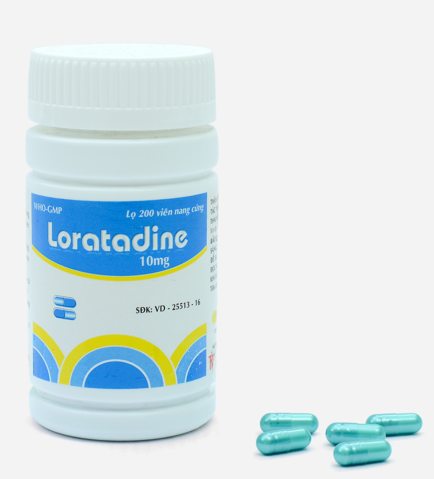 Để xa tầm tay trẻ em. Đọc kỹ hướng dẫn sử dụng trước khi dùng. THÀNH PHẦN: Mỗi viên nang cứng chứa: Thành phần dược chất: Loratadin ………………………… 10 mg Thành phần tá dược: Tinh bột sắn, Lactose monohydrat, PVP. K30, Natri starch glycolat, Talc, Magnesi stearat, Nang rỗng số 4. DẠNG BÀO CHẾ: Viên nang cứng số 4 màu xanh - xanh, bên trong chứa bột thuốc màu trắng. CHỈ ĐỊNH Viêm mũi dị ứng, viêm kết mạc dị ứng. Ngứa và mày đay liên quan đến histamin. CÁCH DÙNG, LIỀU DÙNG Cách dùng: Dùng theo đường uống. Liều lượng Người lớn, người cao tuổi và trẻ em từ 12 tuổi trở lên: 1 viên/lần, 1 lần/ngày. Trẻ em 2 - 12 tuổi: Không dùng ở dạng viên thuốc này. Người bị suy gan hoặc suy thận nặng (độ thanh thải creatinin < 30 ml/phút): 1 viên/lần, cứ 2 ngày 1 lần. CHỐNG CHỈ ĐỊNH Quá mẫn với bất kỳ thành phần nào của thuốc. CẢNH BÁO VÀ THẬN TRỌNG Suy gan. Khi dùng loratadin, có nguy cơ khô miệng, đặc biệt ở người cao tuổi và tăng nguy cơ sâu răng. Do đó, cần phải vệ sinh răng miệng sạch sẽ khi dùng loratadin. Cảnh báo đối với tá dược lactose: Bệnh nhân mắc các rối loạn di truyền hiếm gặp về không dung nạp galactose, chứng thiếu hụt lactase Lapp hoặc rối loạn hấp thu glucose-galactose không nên sử dụng thuốc này. SỬ DỤNG CHO PHỤ NỮ CÓ THAI VÀ CHO CON BÚ Thời kỳ mang thai: Chưa có những nghiên cứu đầy đủ và kiểm tra tốt về sử dụng loratadin trong thai kỳ. Do đó chỉ dùng loratadin trong thai kỳ khi cần thiết, với liều thấp và trong thời gian ngắn. Thời kỳ cho con bú: Loratadin và các chất chuyển hóa descarboethoxyloratadin tiết vào sữa mẹ. Nếu cần sử dụng loratadin ở người cho con bú, chỉ dùng với liều thấp và trong thời gian ngắn. ẢNH HƯỞNG CỦA THUỐC LÊN KHẢ NĂNG LÁI XE, VẬN HÀNH MÁY MÓC Thuốc có thể gây chóng mặt, nên thận trọng khi đang lái xe và đang vận hành máy móc. TƯƠNG TÁC, TƯƠNG KỴ Tương tác Dùng đồng thời với cimetidin làm tăng nồng độ loratadin trong huyết tương 60%, do cimetidin ức chế chuyển hóa của loratadin. Điều này không có biểu hiện lâm sàng. Dùng đồng thời với ketoconazol làm tăng nồng độ loratadin trong huyết tương gấp 3 lần do ức chế CYP3A4. Điều này không có biểu hiện lâm sàng, vì loratadin có chỉ số điều trị rộng. Điều trị đồng thời loratadin và erythromycin dẫn đến tăng nồng độ loratadin trong huyết tương. AUC (diện tích dưới đường cong của nồng độ theo thời gian) của loratadin tăng trung bình 40% và AUC của descarboethoxyloratadin tăng trung bình 46% so với điều trị loratadin đơn độc. Trên điện tâm đồ không có thay đổi về khoảng QTc. Về mặt lâm sàng, không có biểu hiện sự thay đổi tính an toàn của loratadin, và không có thông báo về tác dụng an thần hoặc hiện tượng ngất khi điều trị đồng thời 2 thuốc này. Tương kỵ Do không có các nghiên cứu về tính tương kỵ của thuốc, không trộn lẫn thuốc này với các thuốc khác. TÁC DỤNG KHÔNG MONG MUỐN Loạn nhịp thất nặng đã xảy ra khi điều trị với một số thuốc kháng thụ thể histamin H1 thế hệ 2. Điều đó không xuất hiện khi điều trị bằng loratadin. Khi sử dụng loratadin với liều lớn hơn 10 mg hàng ngày, những tác dụng sau đây có thể xảy ra: Thường gặp: Đau đầu, khô miệng, chóng mặt, khô mũi, hắt hơi, viêm kết mạc. Hiếm gặp: Trầm cảm, tim đập nhanh, loạn nhịp nhanh trên thất, đánh trống ngực, buồn nôn, chức năng gan bất bình thường, kinh nguyệt không đều, ngoại ban, nổi mày đay và choáng phản vệ. QUÁ LIỀU VÀ CÁCH XỬ TRÍ Ở người lớn khi uống quá liều (40 – 180 mg) có những biểu hiện: buồn ngủ, nhịp tim nhanh, nhức đầu. Ở trẻ em khi uống sirô quá liều (vượt 10 mg) biểu hiện ngoại tháp và đánh trống ngực. Xử trí: Điều trị triệu chứng và hỗ trợ, bắt đầu ngay và duy trì chừng nào còn cần thiết. Loratadin không bị loại bằng thẩm tách máu. ĐẶC TÍNH DƯỢC LỰC HỌC Nhóm dược lý: Thuốc kháng histamin, đối kháng thụ thể H1. Mã ATC: R06AX13 Loratadin là thuốc kháng histamin 3 vòng có tác dụng kéo dài đối kháng chọn lọc trên thụ thể H1 ngoại biên và không có tác dụng làm dịu trên thần kinh trung ương. Loratadin thuộc nhóm thuốc đối kháng thụ thể H1 thế hệ thứ hai (không an thần). Loratadin có tác dụng làm nhẹ bớt triệu chứng của viêm mũi và viêm kết mạc dị ứng do giải phóng histamin. Loratadin còn có tác dụng chống ngứa và nổi mày đay liên quan đến histamin. Tuy nhiên loratadin không có tác dụng bảo vệ hoặc trợ giúp lâm sàng đối với trường hợp giải phóng histamin nặng như choáng phản vệ. Thuốc kháng histamin không có vai trò trong điều trị hen. Loratadin có tần suất tác dụng phụ, đặc biệt đối với hệ thần kinh trung ương, thấp hơn những thuốc kháng histamin thuộc thế hệ thứ hai khác. ĐẶC TÍNH DƯỢC ĐỘNG HỌC Loratadin hấp thu nhanh sau khi uống. Nồng độ đỉnh trong huyết tương trung bình của loratadin và chất chuyển hóa có hoạt tính của nó (descarboethoxyloratadin) tương ứng là 1,5